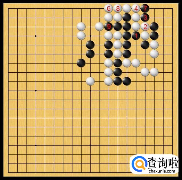 黑棋这个时候在中腹黑9处落子,黑9的落子使得黑棋叫吃中腹的白四子。如图所示。