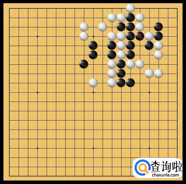 黑方先手,黑方敏锐的观察到白方中腹白子存在问题,于是,黑方在黑1处落子打吃白一子,黑1的打吃非常讲究,对白棋起到了连打带削的作用。如图所示。