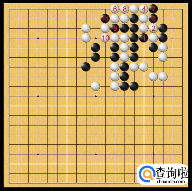 而这个时候,黑棋剑锋一转,黑棋在黑11处落子,打吃渡过的白棋。白棋虽然渡过但由于没连接上,再加上黑棋对渡过的白棋的气眼完全堵死,这样,白棋就被黑棋断打掉。如图所示。