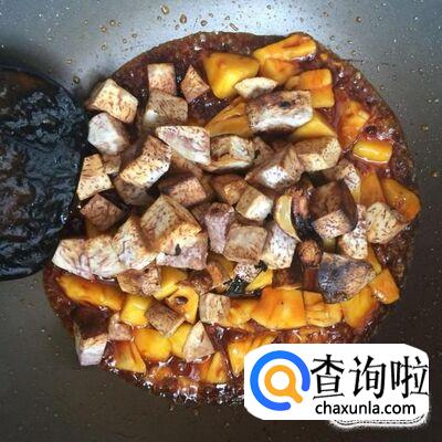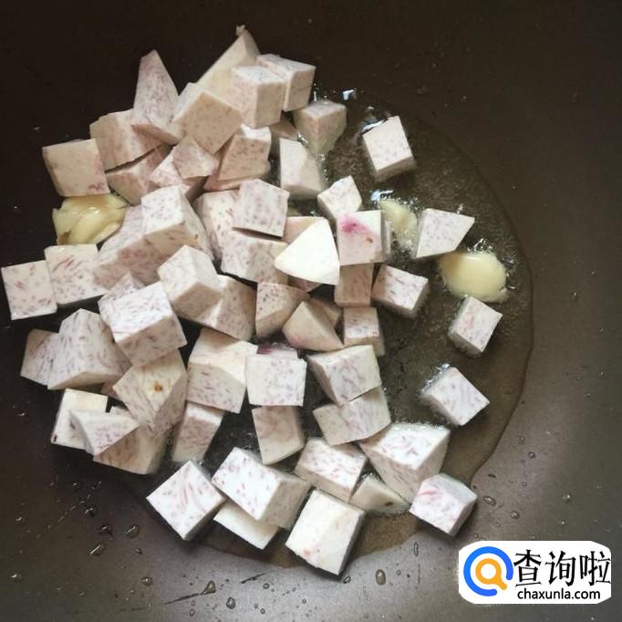 接着把刚才炸好的香芋倒入锅中,翻炒三分钟就可以出锅了。