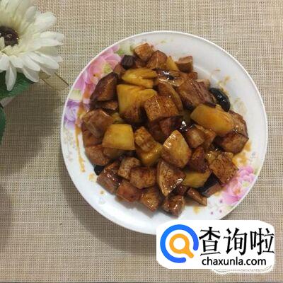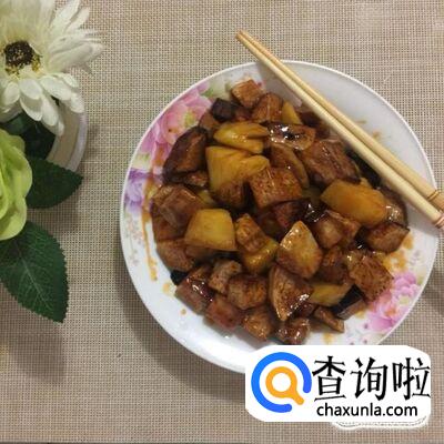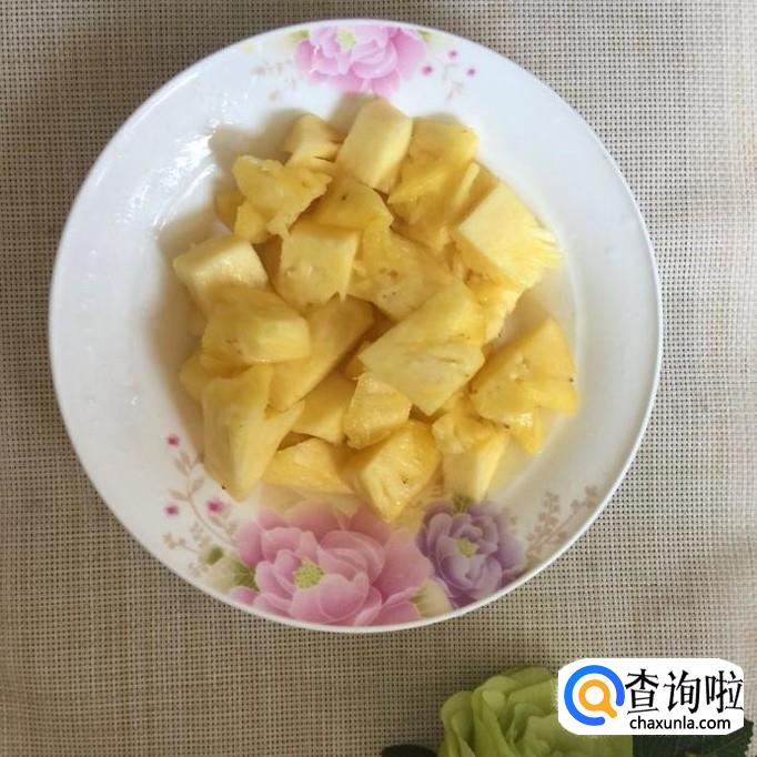 然后把菠萝去皮切成丁,倒入锅中翻炒两分钟。