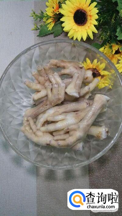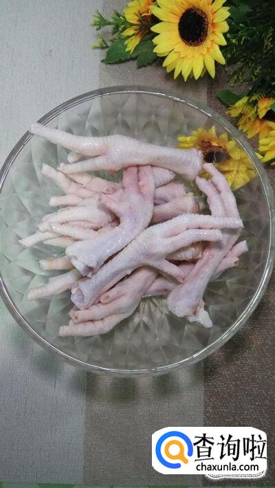 准备适量鸡爪,用清水洗净后去除指甲,放入碗中备用。注意,鸡爪最好选用新鲜的鸡爪,如果是冰冻的可以放置一会儿。