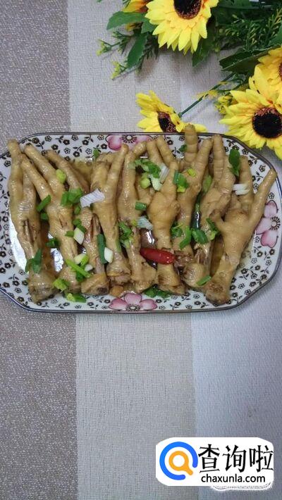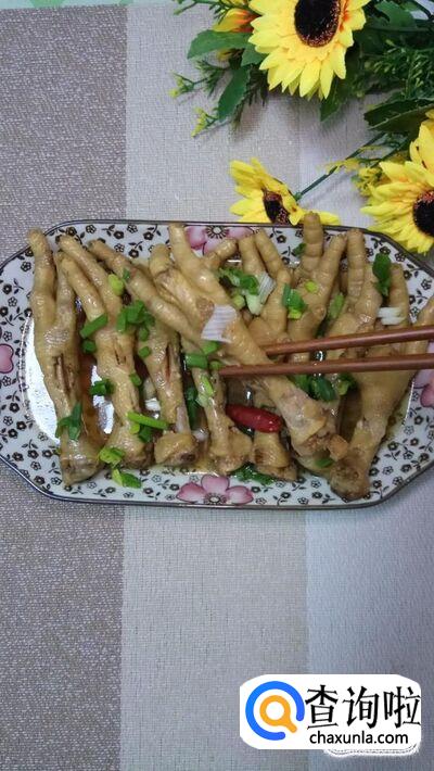 将鸡爪盛入盘中,准备适量小葱切碎,撒在上面,就可以食用了,美味营养,家里人都非常喜欢。