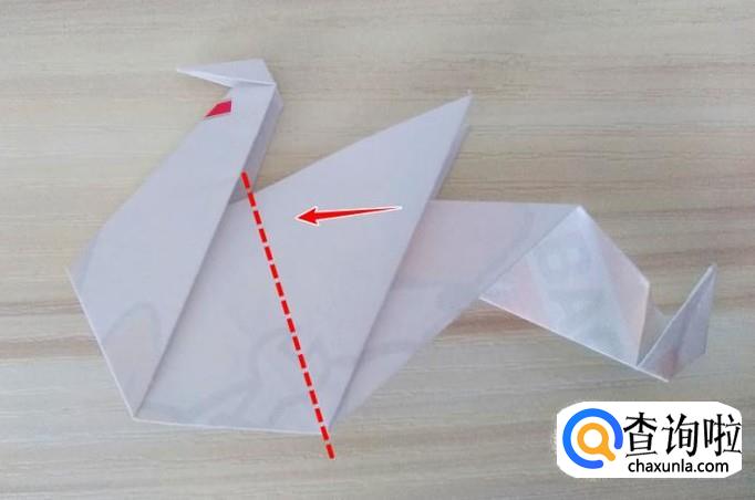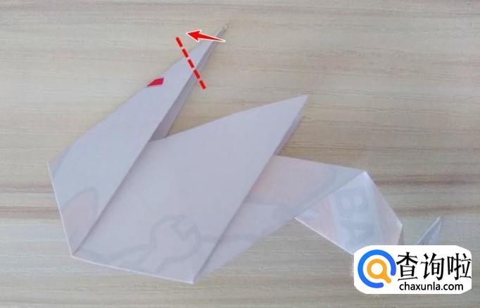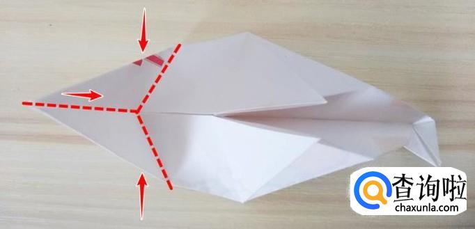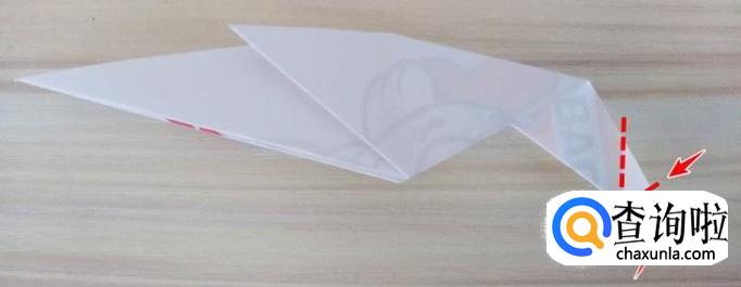 将翅膀翻到右边,开始折头部,沿着虚线将左边的尖角整体向上翻折,折叠后的两个边如图平行;
