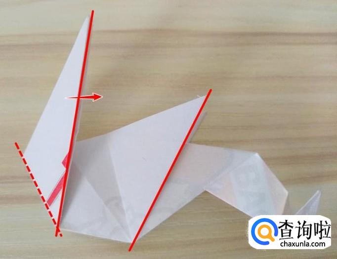 沿着虚线折出小火龙的头,奖翅膀沿着虚线翻过来;