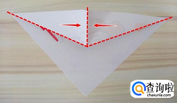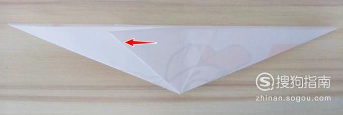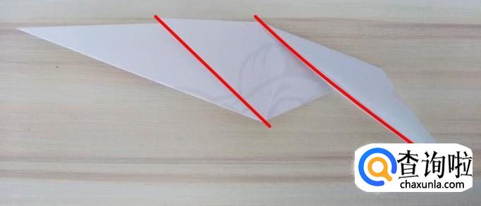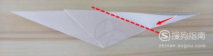 先将翅膀翻到左边,再将右边的尖角沿着虚线整体向下翻折,折痕不超过中线,折出来的两个边要平行;