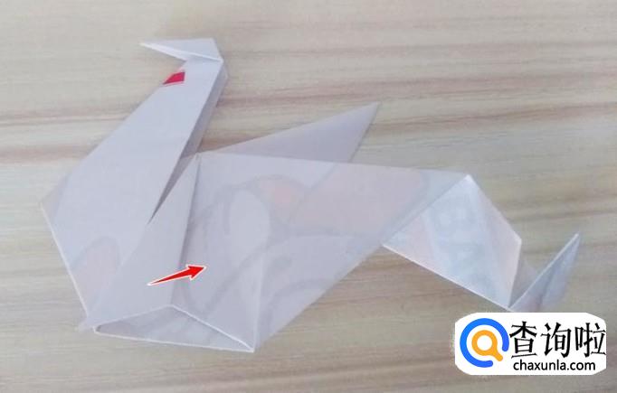 将刚折好的尖角展开,利用折痕如图折叠,形成小火龙的尾巴;