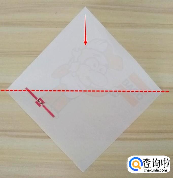 沿着虚线向上翻折,当然左右两条长的折痕可以先分别将两条直角边向上对折折出来,翻折的同时捏扁中间的“翅膀”,反面同样折法;