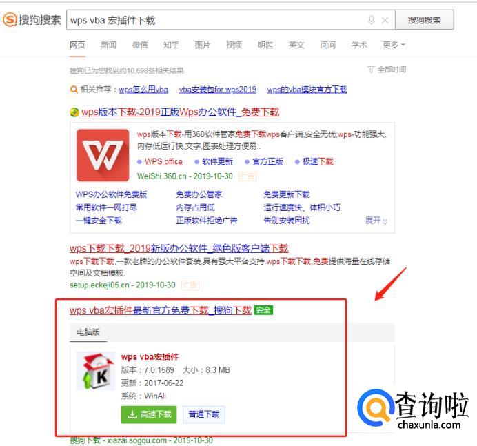 打开浏览器,在搜索框内输入“WPS VBA”,选择下拉菜单的第一个选项“wps vba 宏插件下载”。