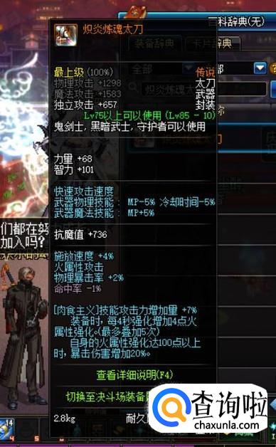 首先,武器方面我们可以选择85级传说太刀“炽炎炼魂太刀”,该装备可以提升【肉食主义】7%的技能攻击力增加量。
