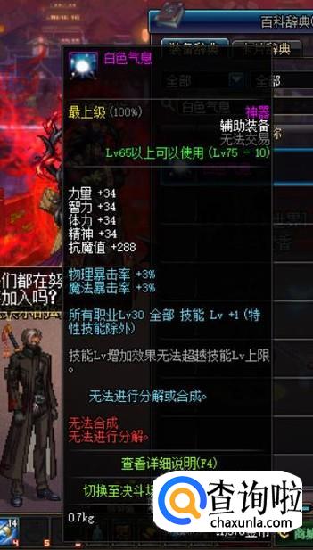 而左槽方面,通过遗忘之地的相关内容,集齐足够的“七彩转移晶石”在NPC乔安·费雷诺处兑换75级神器辅助装备“白色气息”,也可以增加1级的BUFF技能等级。