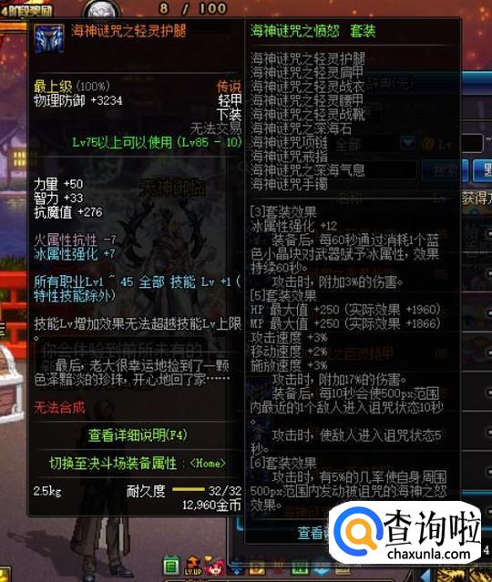下装部位不用多说,直接选择性价比最高的“海神谜咒之轻灵护腿”即可,可以提升1级的BUFF技能等级,且获取十分容易。