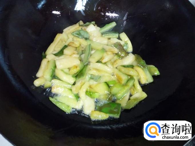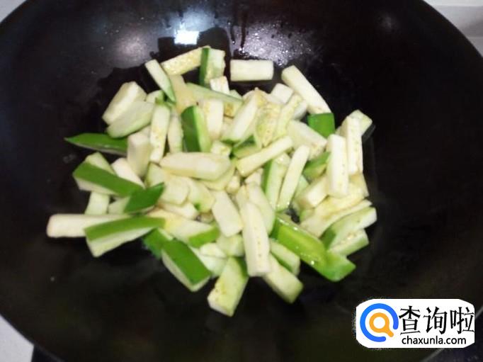 锅里放入油加热,油热后放入茄子翻炒,炒至茄子变软,没有水气后,关火,盛出备用。
