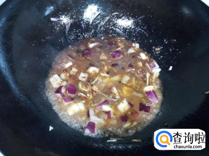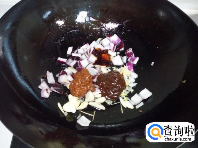 放入一匙儿豆酱,一匙儿甜面酱,一匙儿蚝油,放入少量的水,翻炒成酱汁(不用放盐)。