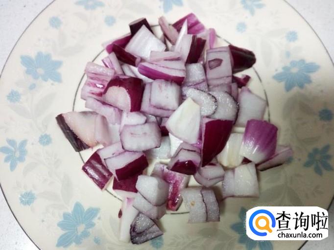 圆葱去皮,用水清洗干净,控干水分,切成小块。切好葱,姜,蒜,备用。
