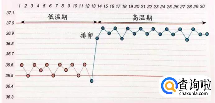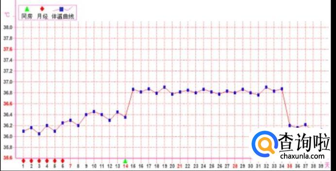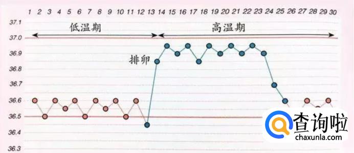 假设女性的月经周期28天,我们从上图可以看到,基础体温曲线呈现标准的高低温两相变化。从月经开始-排卵日,低温期14天;排卵后持续高温14天,其中第14天为排卵日,这一天里成功怀孕的概率比较大。
