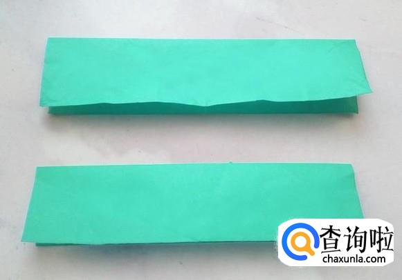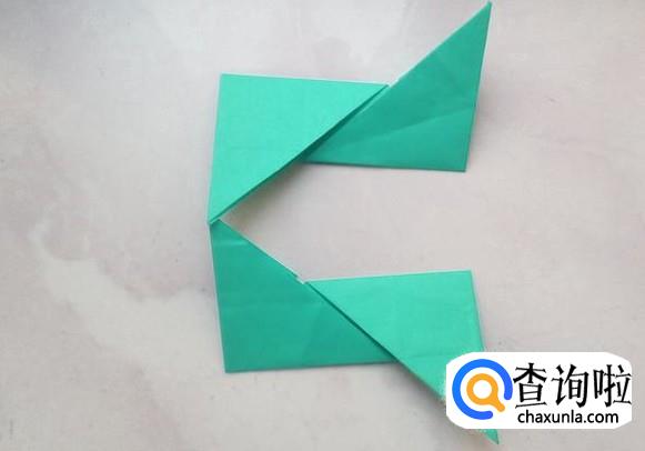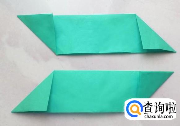 再将上面的折纸左侧折下来,下面的折纸左侧折上去。