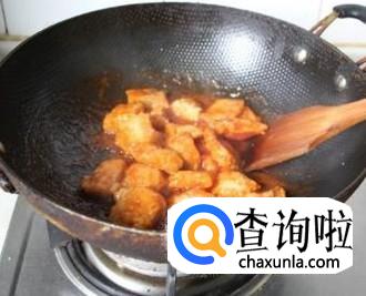 然后我们加入煎炸好的粉嘎巴,翻炒,再盖上锅盖焖2分钟,炸糖醋粉嘎巴就ok了。