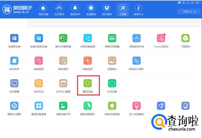 打开 PC 端爱思助手,点击「工具箱」中的「重启」功能,如能正常开机即恢复正常,如不成功则进行下一步。