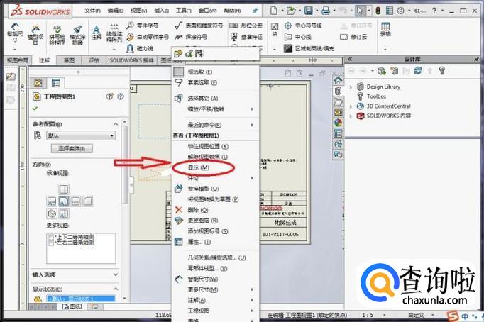 再次进入到缺失工程图的图纸中,点击视图右击,然后选中显示命令,点击确定就会零件图中就会重新显示出来之前缺失的工程图