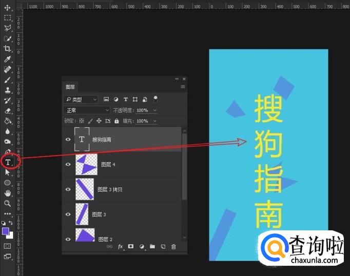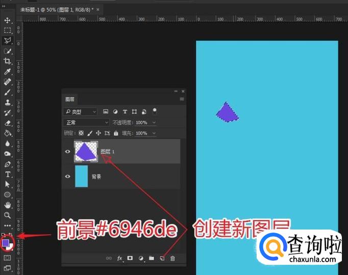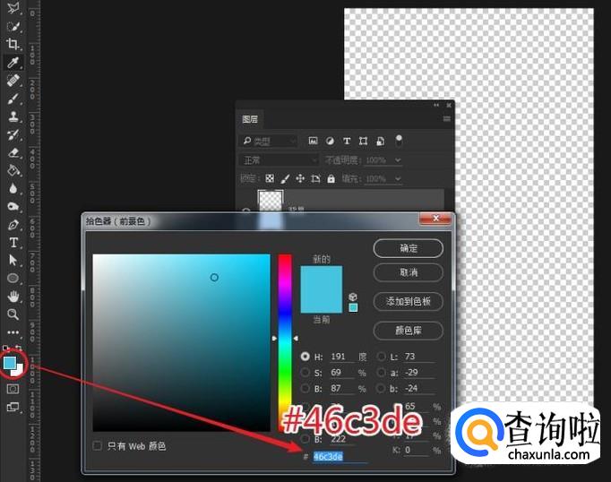 在工具箱下方,找到前景设置色块,点击设置前景的颜色为:#46c3de(靑色)。