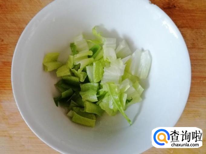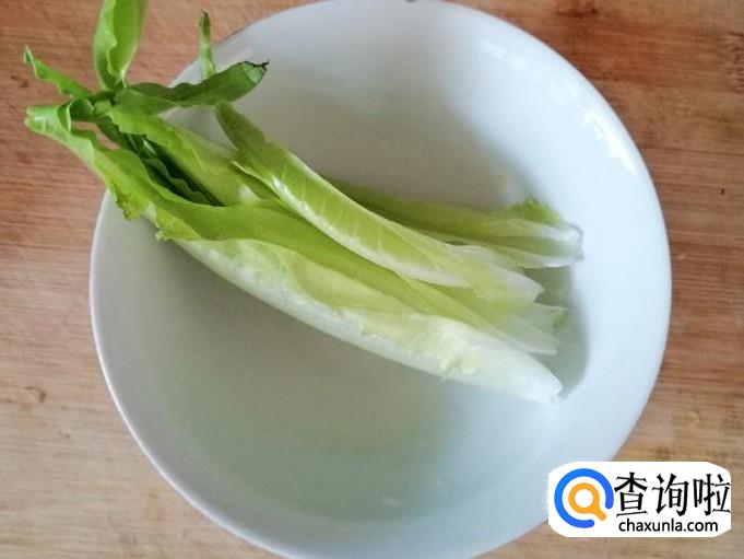 准备我适量莴苣嫩叶,用清水把莴苣叶子洗净,再放入盐水中泡一会,最后洗净切好待用,莴苣叶子生吃特别清脆爽口。