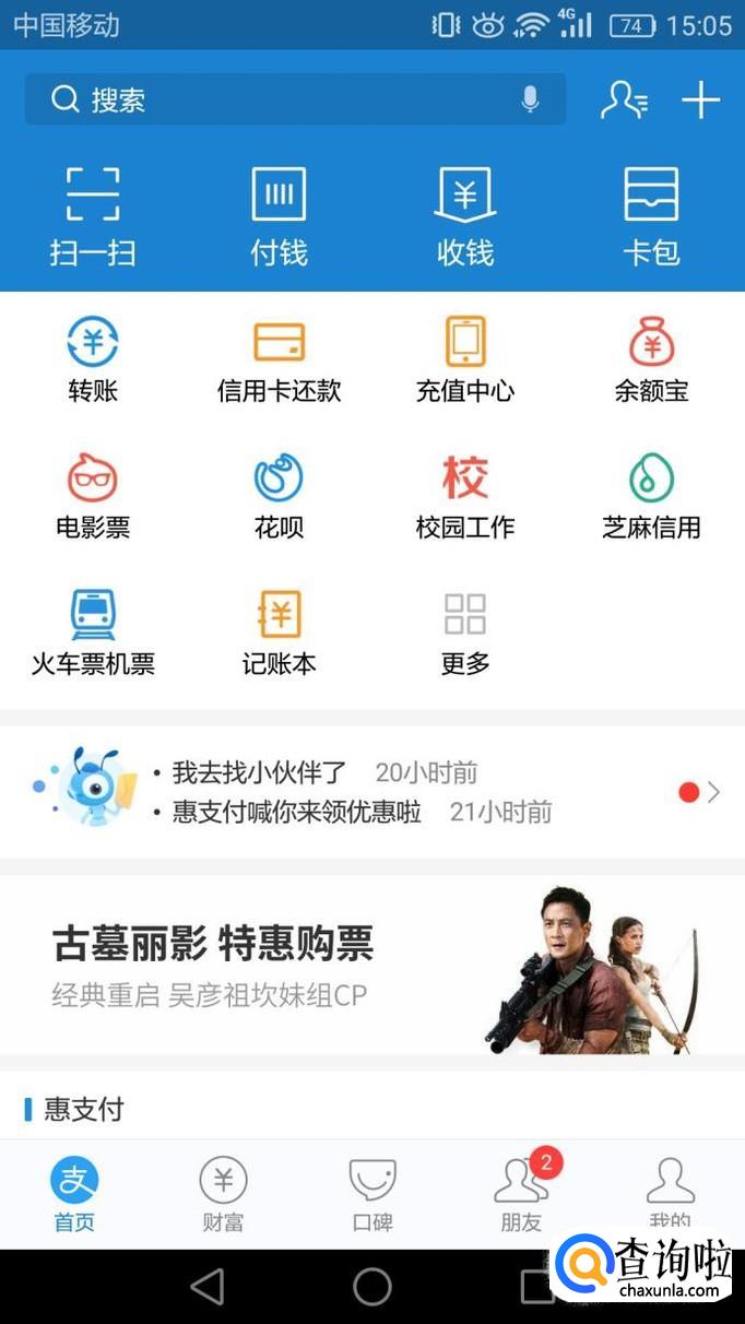 在手机菜单中找到支付宝,打开登录支付宝,进入主页面后,在页面最右下角点击我的。