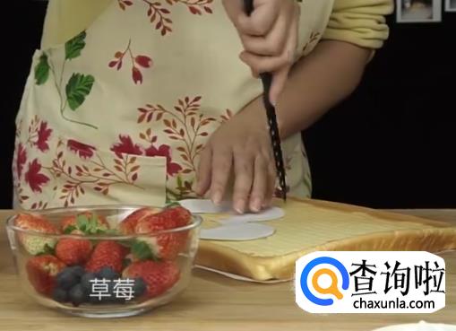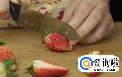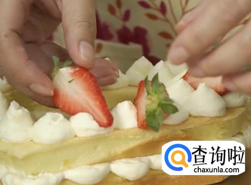 将草莓切块,慢慢摆到蛋糕上去。
