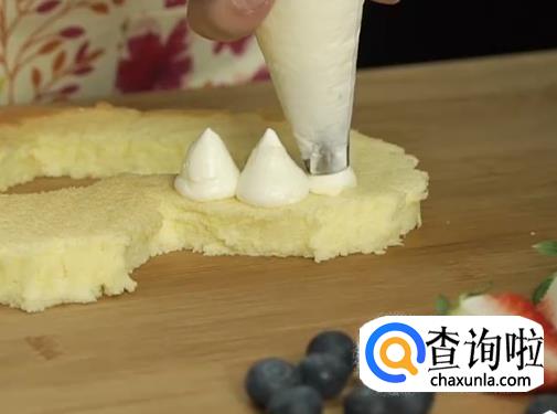 取一片心形蛋糕片挤上淡奶油再盖上另一片蛋糕片挤上淡奶油。