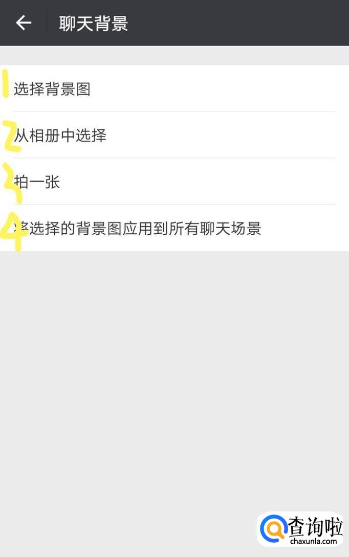 然后我们看到4个选择项,分别如下图所示,也就是说,我们可以选择系统里的聊天背景图,也可以选择我们的本地图片,或者立即拍一张美照作为聊天背景图哦!