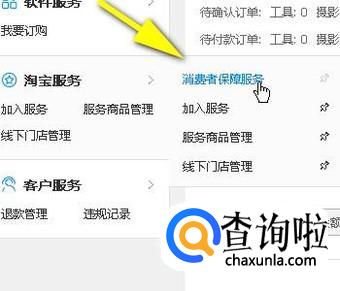 鼠标放在右侧的>符号上,这时,自动弹出一列菜单,从中找到并点击:消费者保障服务
