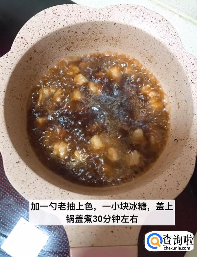然后往锅中加入一勺的老抽和一小块的冰糖盖上盖子,小火煮30分钟左右,如下图所示。
