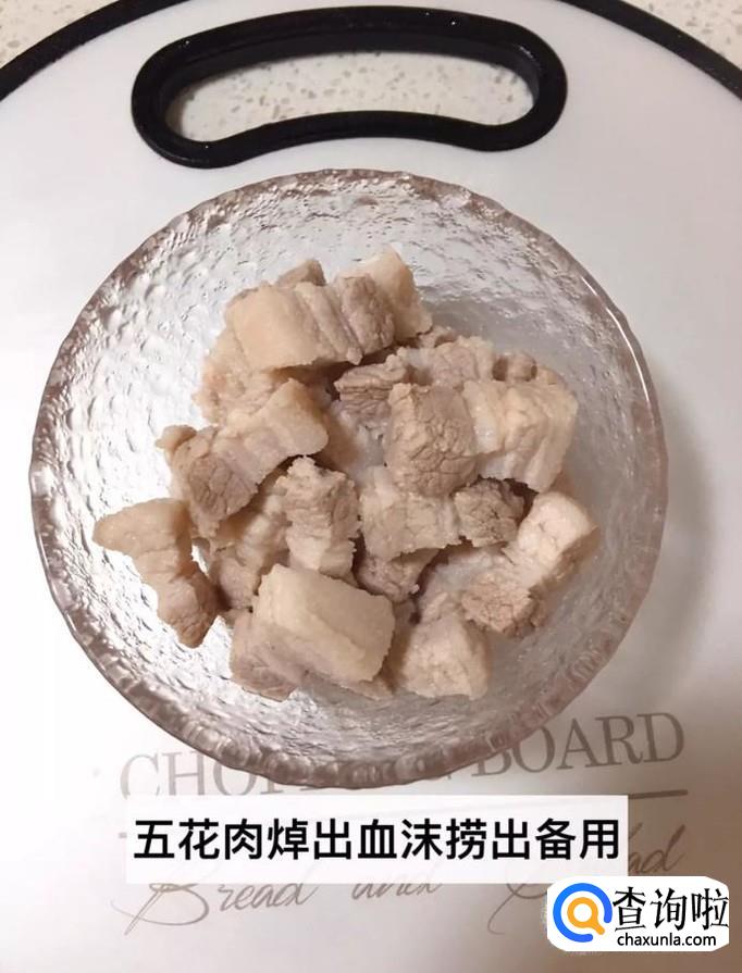 然后锅中放入适量的清水,待水烧开,倒入五花肉焯两分钟,捞出控干,如下图所示。