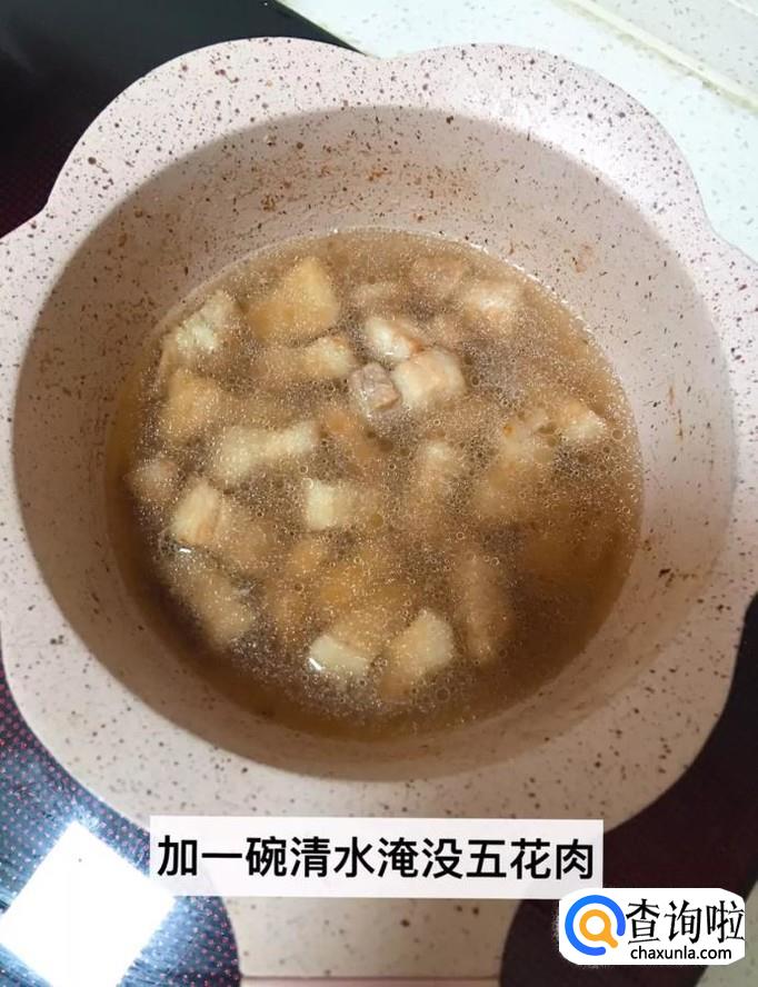 然后把五花肉倒进去翻炒两分钟,之后加入一碗清水,如下图所示。