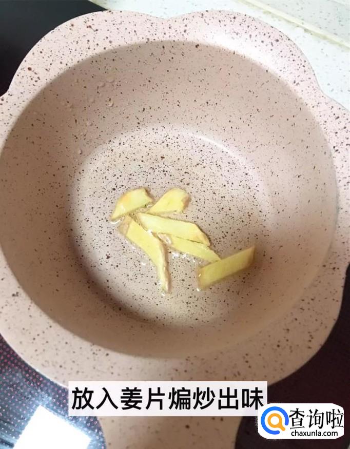 接着往锅中放入适量的食用油,待油冒烟,倒入姜片煸炒出香味,如下图所示。