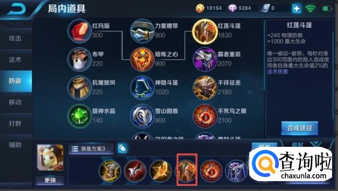 第四件装备我们可以出红莲斗篷,既然要出肉装,那么前面的攻击装备已经够了,红莲斗篷是有被动属性的,可以给对方造成伤害,当对方近身打我们的话,虽然我们没有位移,但红莲斗篷是可以起到一定伤害对方的效果的。