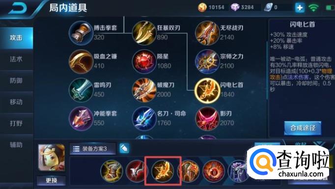 第三件装备我们可以闪电匕首,这个装备可以增加30%的移动速度,其次还能增加暴击率,其次还能增加移速,移速是非常重要的,可以在前期就可以更好的输出了,不管是拆塔还是打人,都是很疼的。