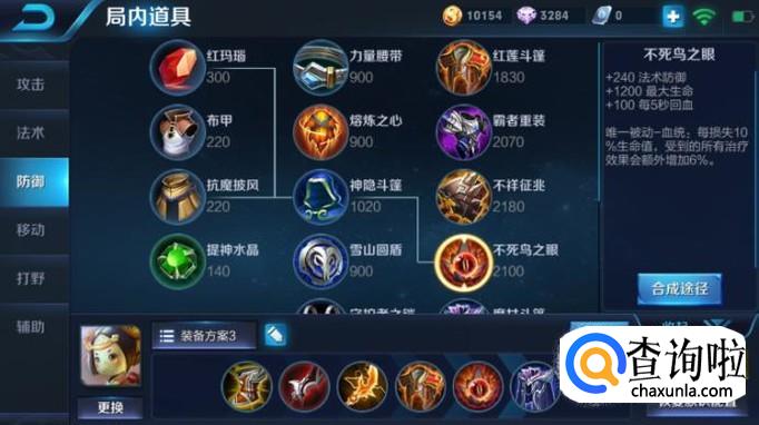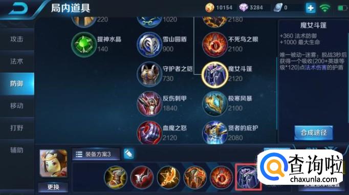 第六件装备我们可以出魔女斗篷,此时对方的英雄往往也是后期了,尤其是法师的伤害是非常高的,所以我们最后需要出魔女斗篷,这个装备可以增加360的法术防御,其次还能增加1000点血量,此时我们是不会被对方的法师直接杀掉了,而且还能攻击对方。