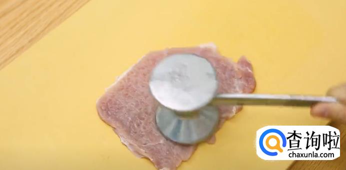 然后,把猪排切成薄片,用肉锤拍松。接着在猪排里加入腌肉汁,用手抓匀,盖起来腌制1个小时,这样的话,炸好之后就会非常入味。