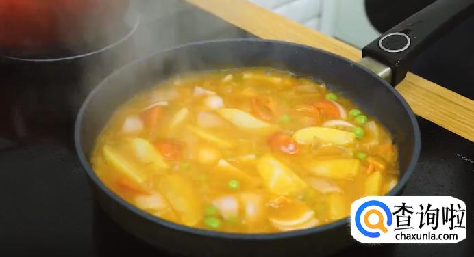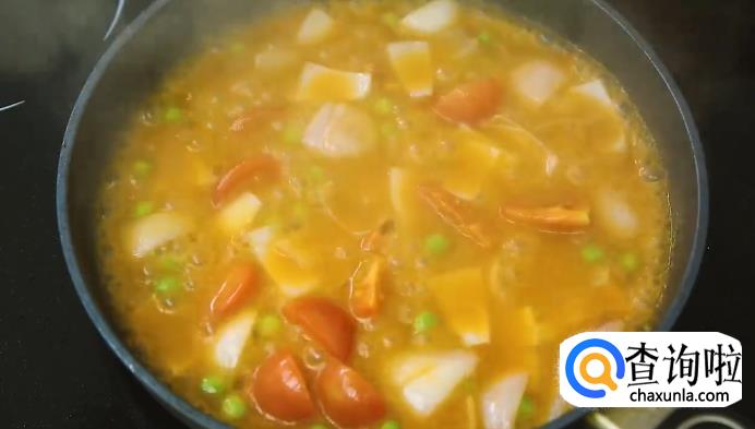 另起一口平底锅,烧热后加适量的油,把土豆放进去煎到焦黄,捞出来备用。再将黄油放进锅里,中小火加热到融化,放入洋葱炒软,再倒入之前调好的酱汁煮开,放入豌豆、番茄,翻炒1分钟左右。最后,加入之前煎好的土豆,拌炒均匀就可以了。