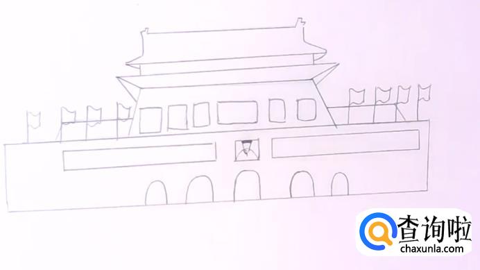 再画上两侧红旗中间的灯笼和顶上的国徽。