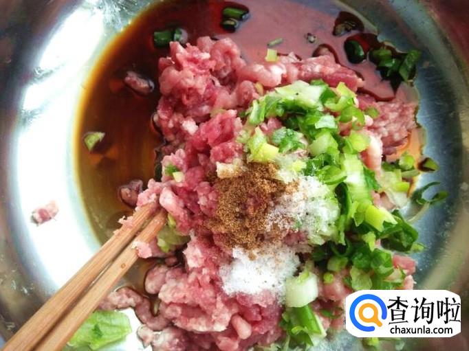 准备一颗小葱,作者总是忘记买生姜,所以生姜就不用了,你自己可以自行选择。小葱切成葱花放进肉馅里,倒上一小勺植物油,然后分别加上食盐、白糖、味素、十三香、酱油适当,顺序不要错哈各位,然后搅拌。