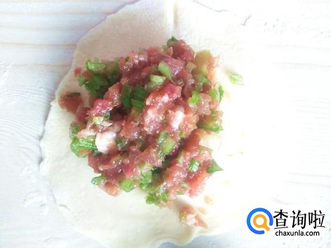 取一些肉馅放在面皮上,不要肉馅太少,不然馅饼是一个面疙瘩不好吃,可是也不能太多,不然你的馅饼可能会“露馅”哦。