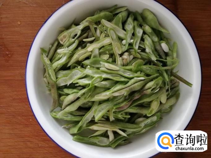 四季豆撕去两侧筋后,清水洗净,斜切成细丝。