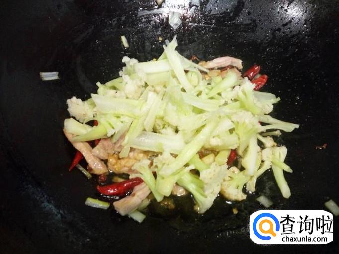 炒至肉颜色微白,放入葱,姜,蒜,红干椒翻炒,放入少许酱油。随即放入有机菜花翻炒,放入料酒,滴少许醋,放入盐。