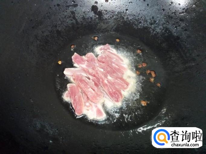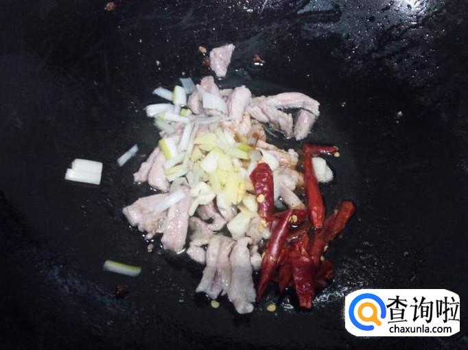 锅里放入油加热,油热后放入花椒爆锅,放入肉翻炒。