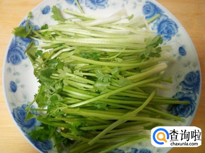香菜收拾清洗干净,控干水分,切成10公分左右长的段。