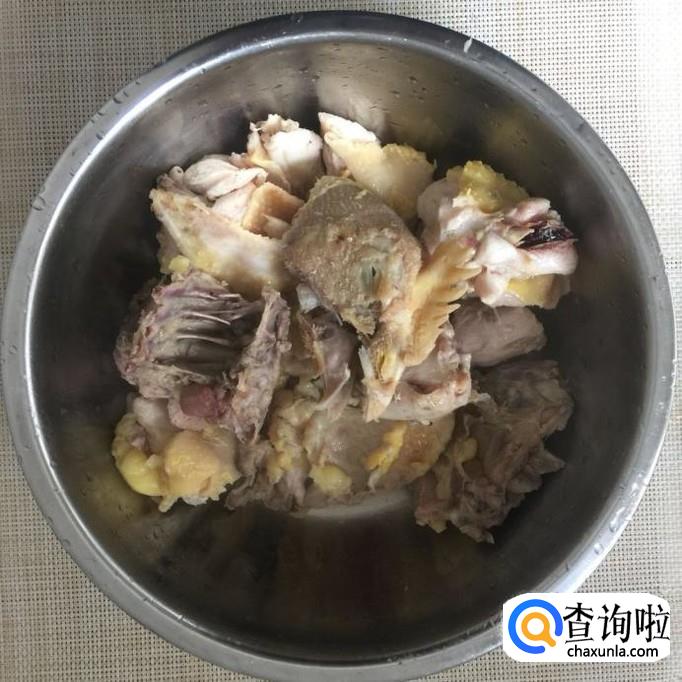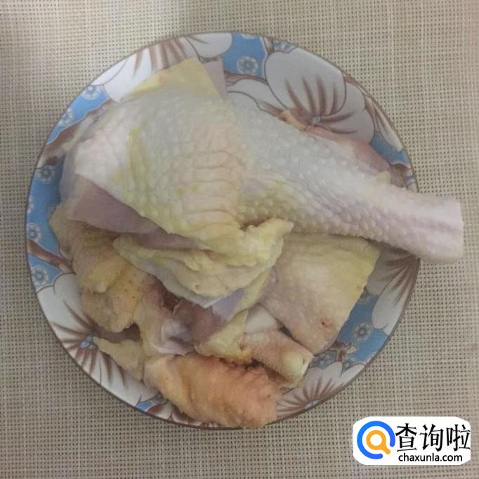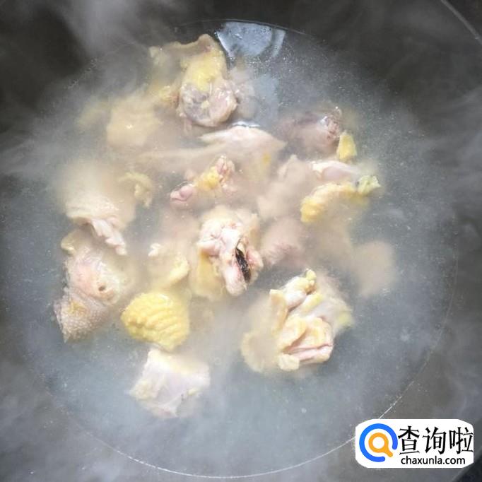 然后把鸡倒入热水中烫两分钟,捞出沥干备用。