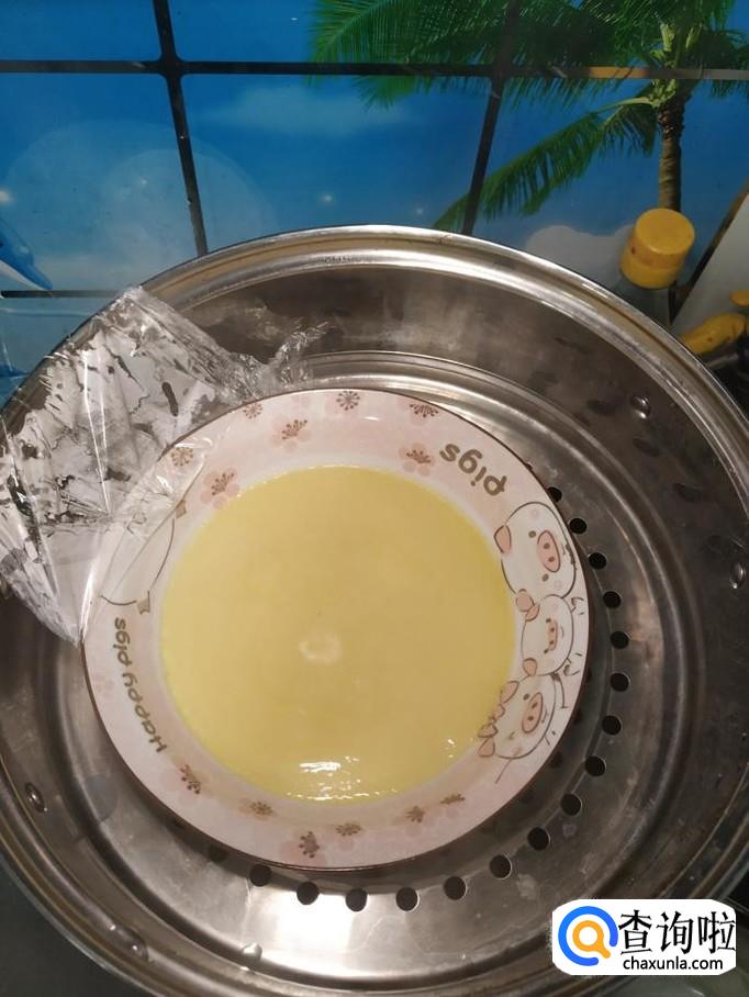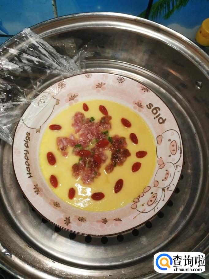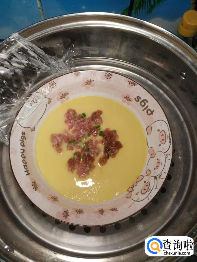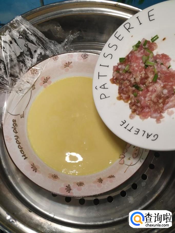 将鸡蛋刚放上蒸锅,水开后,先蒸上五分钟,然后将腌好的肉末放在鸡蛋羹上面。