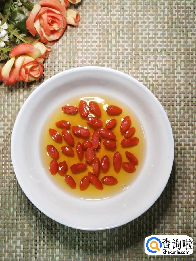 再准备适量枸杞子,用清水泡开,撒上枸杞子。